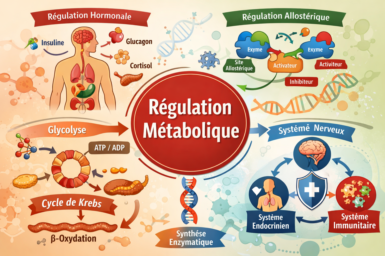 Le cours de Régulation métabolique étudie les mécanismes assurant le contrôle et l’intégration des voies métaboliques des glucides, lipides et protéines. Il met en évidence les régulations endocriniennes et non endocriniennes permettant l’adaptation du métabolisme aux besoins énergétiques et aux conditions de l’environnement, ainsi que le rôle coordonné des systèmes nerveux, endocrinien et immunitaire dans le maintien de l’homéostasie.