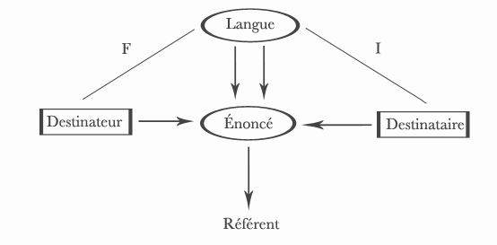 "[...] L'énonciation est l'acte de production d'un énoncé. Un énoncé est généralement une phrase produite à l'oral ou à l'écrit par une personne que l'on appelle le destinateur (c'est donc celui qui parle ou qui écrit). Cet énoncé s'adresse à quelqu'un que l'on appelle le destinataire. La production d'un énoncé par un destinateur s'adressant à un destinataire se déroule dans une situation de communication qui peut être représentée ainsi :