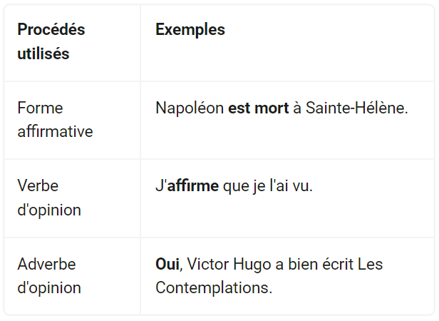 Pour exprimer la certitude, on peut utiliser différents moyens lexicaux ou grammaticaux comme ceux répertoriés dans le tableau suivant :