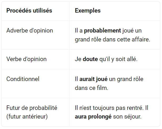 Pour exprimer le doute par exemple, on peut utiliser différents moyens lexicaux ou grammaticaux comme ceux répertoriés dans le tableau suivant :