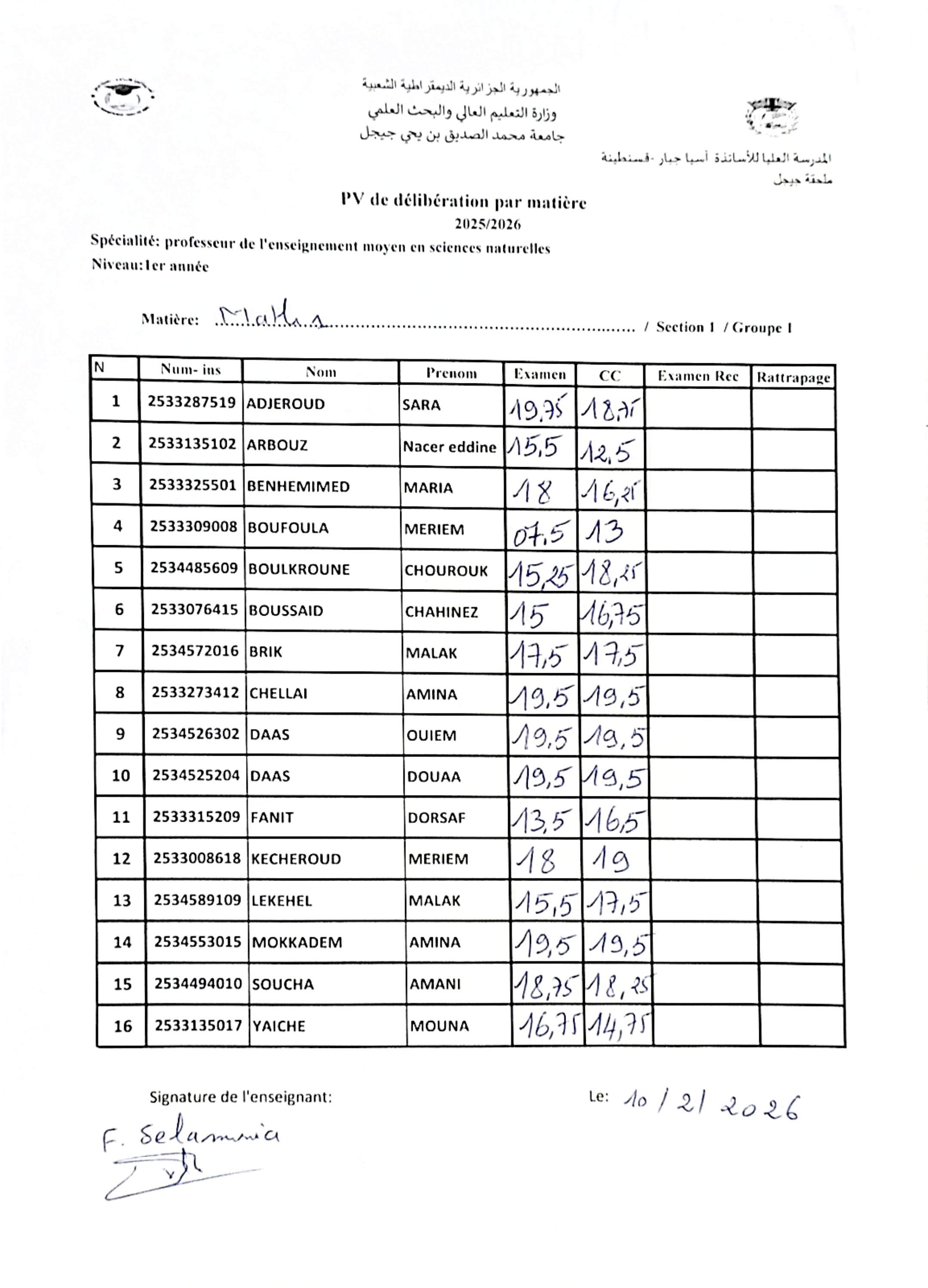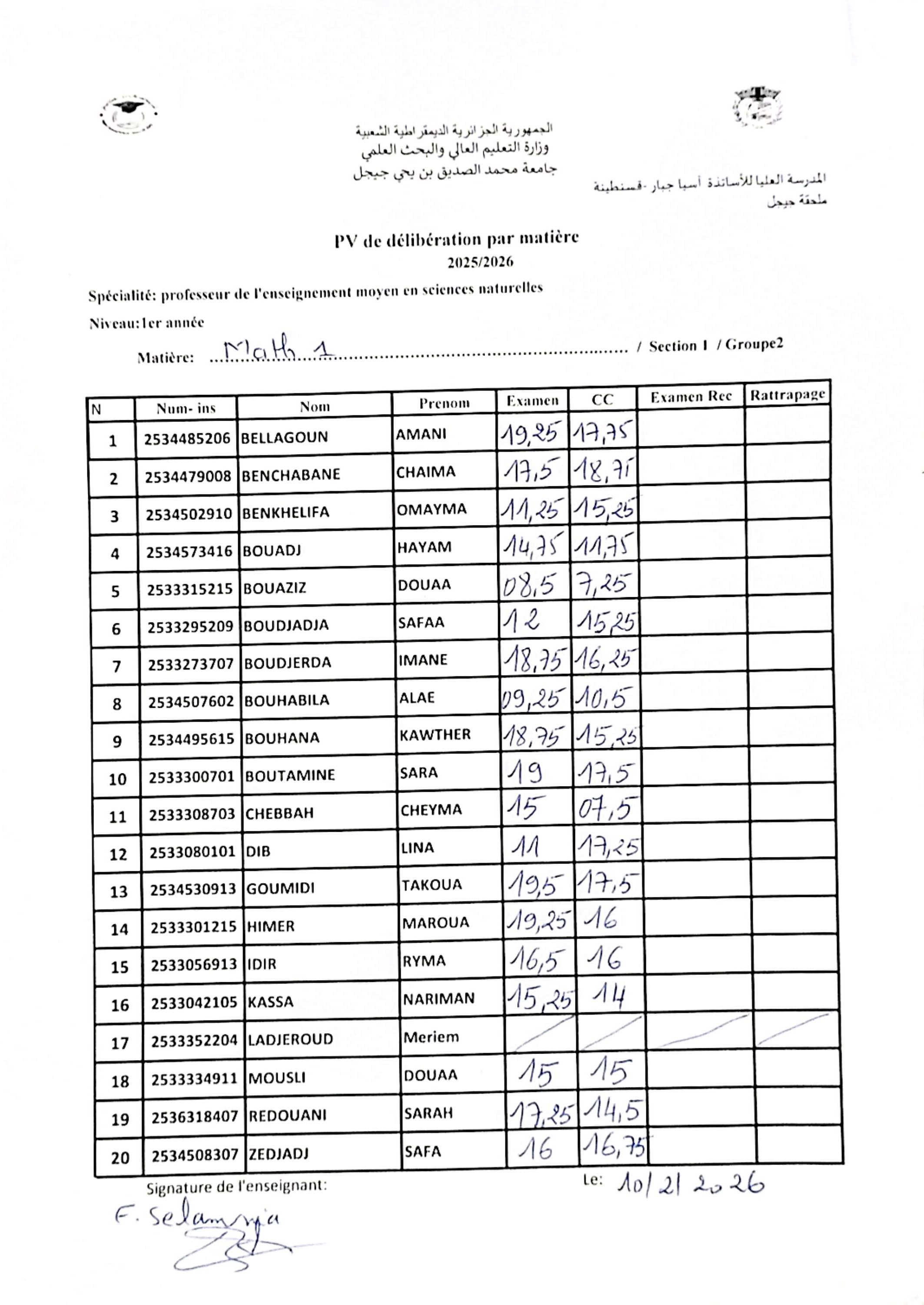 • علامات الأعمال الموجهة+ علامات الامتحان العادي للسداسي الأول