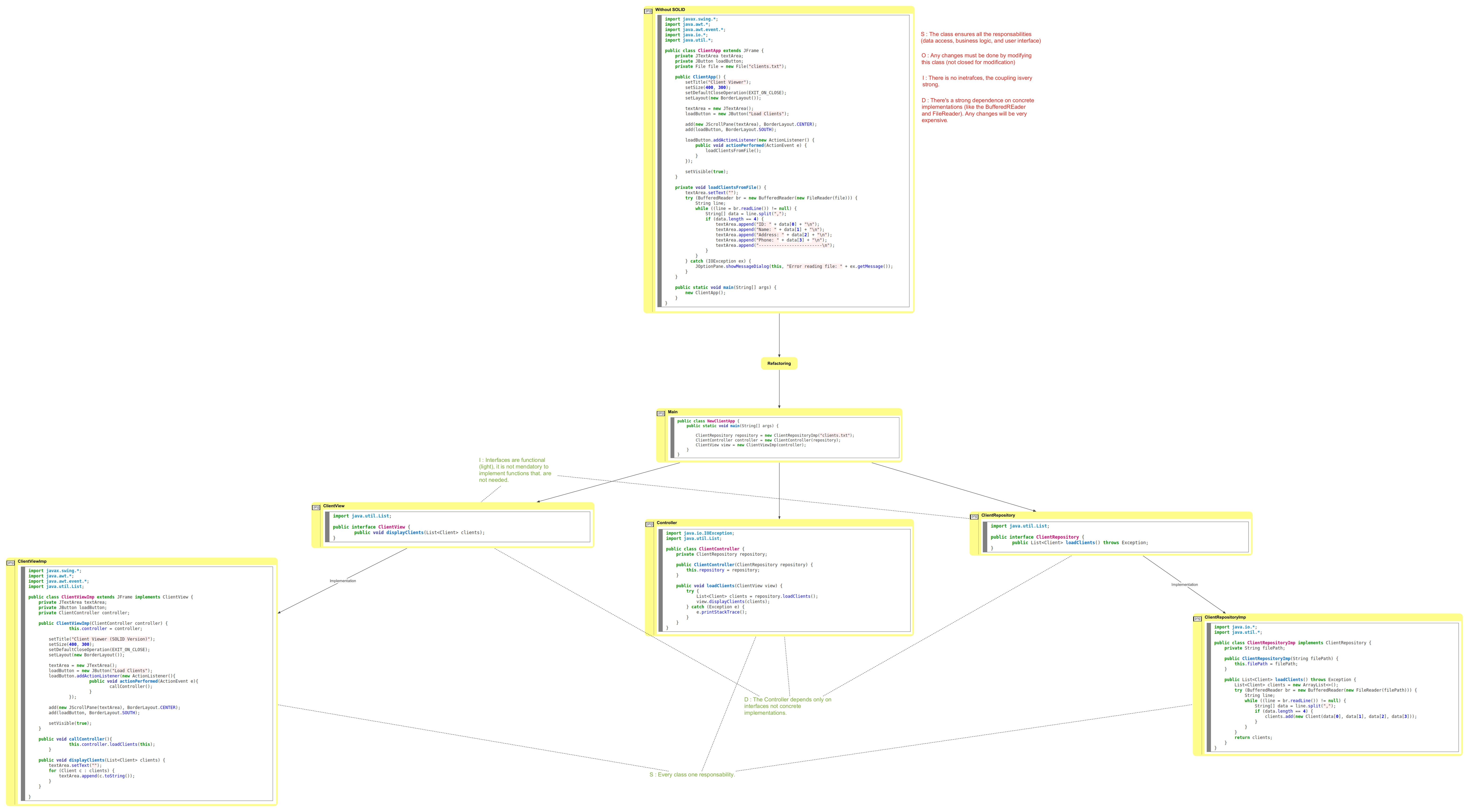 - The first version (WithoutSOLID) does not respect the SOLID principles.