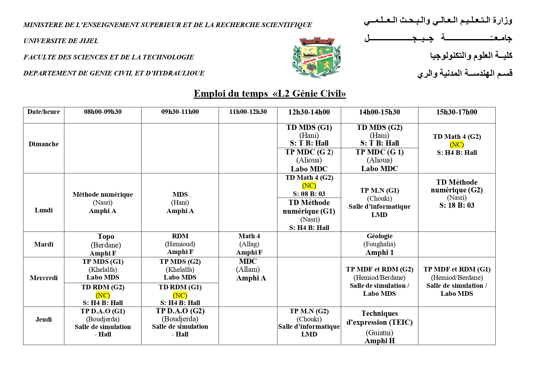 Emplois du Temps S2 Génie civil et Hydraulique 2025/2026
