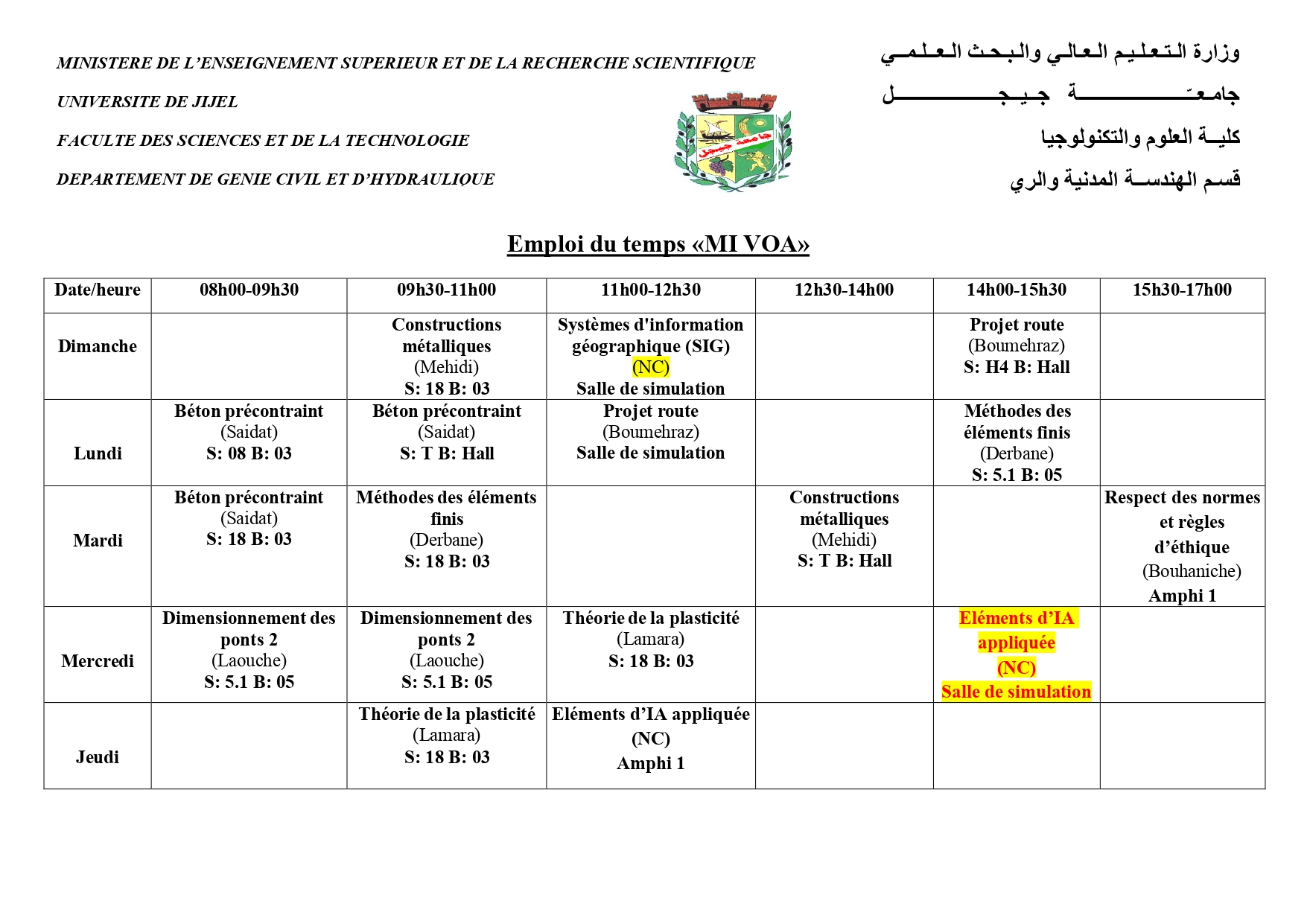 Emplois du Temps S2 Génie civil et Hydraulique 2025/2026