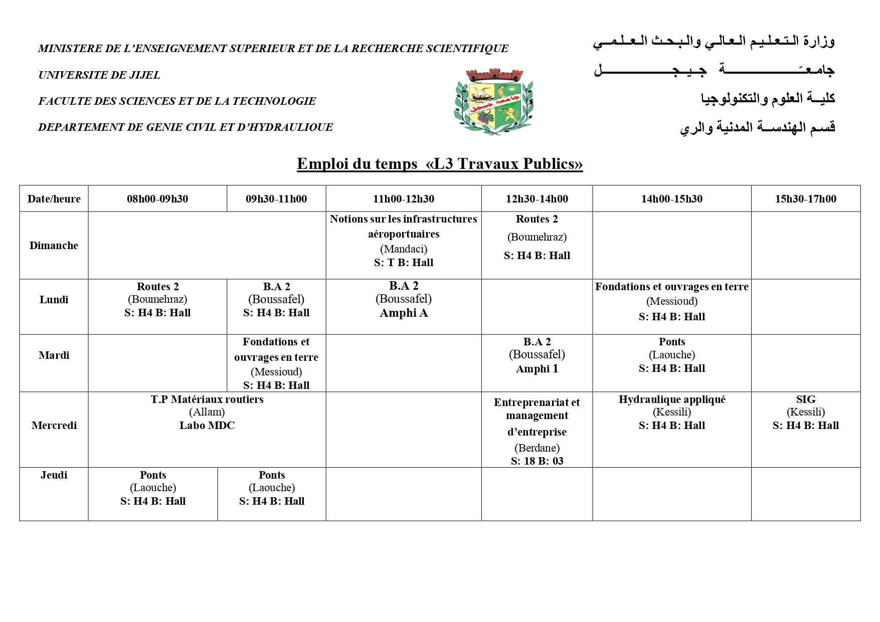 Emplois du Temps S2 Génie civil et Hydraulique 2025/2026